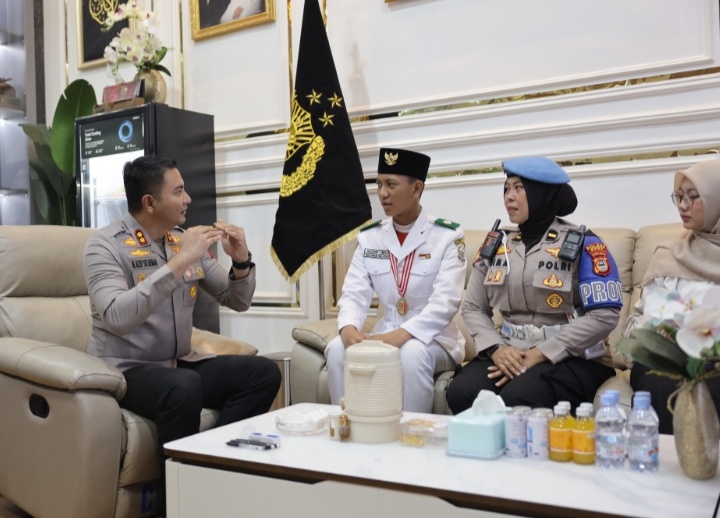 GOWA, SULSEL — Kapolres Gowa, AKBP Muhammad Aldy Sulaiman, S.I.K., M.Si., menerima kedatangan Nadhif, putra daerah Kabupaten Gowa yang baru saja menunaikan tugas mulianya sebagai Pasukan Pengibar Bendera Pusaka (Paskibraka) Nasional tahun 2025 di Istana Merdeka, Jakarta, Sabtu (23/8/2025).
